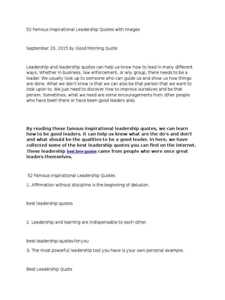 Affirmation without discipline is the beginning of delusion. The most powerful leadership tool you have is your own personal example. 46 inspirational leadership quotes to empower you motivate 46 inspiring great leadership quotes guidance conclusion.