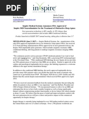 Inspire sleep apnea device mri safety. If your patient has the inspire generator model 3024 they are not eligible for mri scans. It is the only fda approved obstructive sleep apnea treatment that works inside the body with just the click of a button. Inspire was fda approved in 2014 and has been proven both safe and effective in multiple clinical studies.